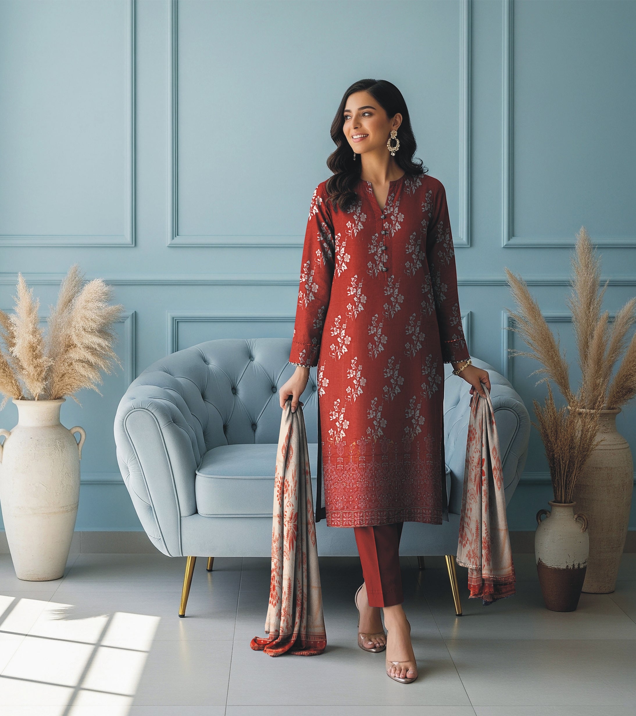 Crimson Charm Linen 3-Piece with Elegant Cutwork Dupatta