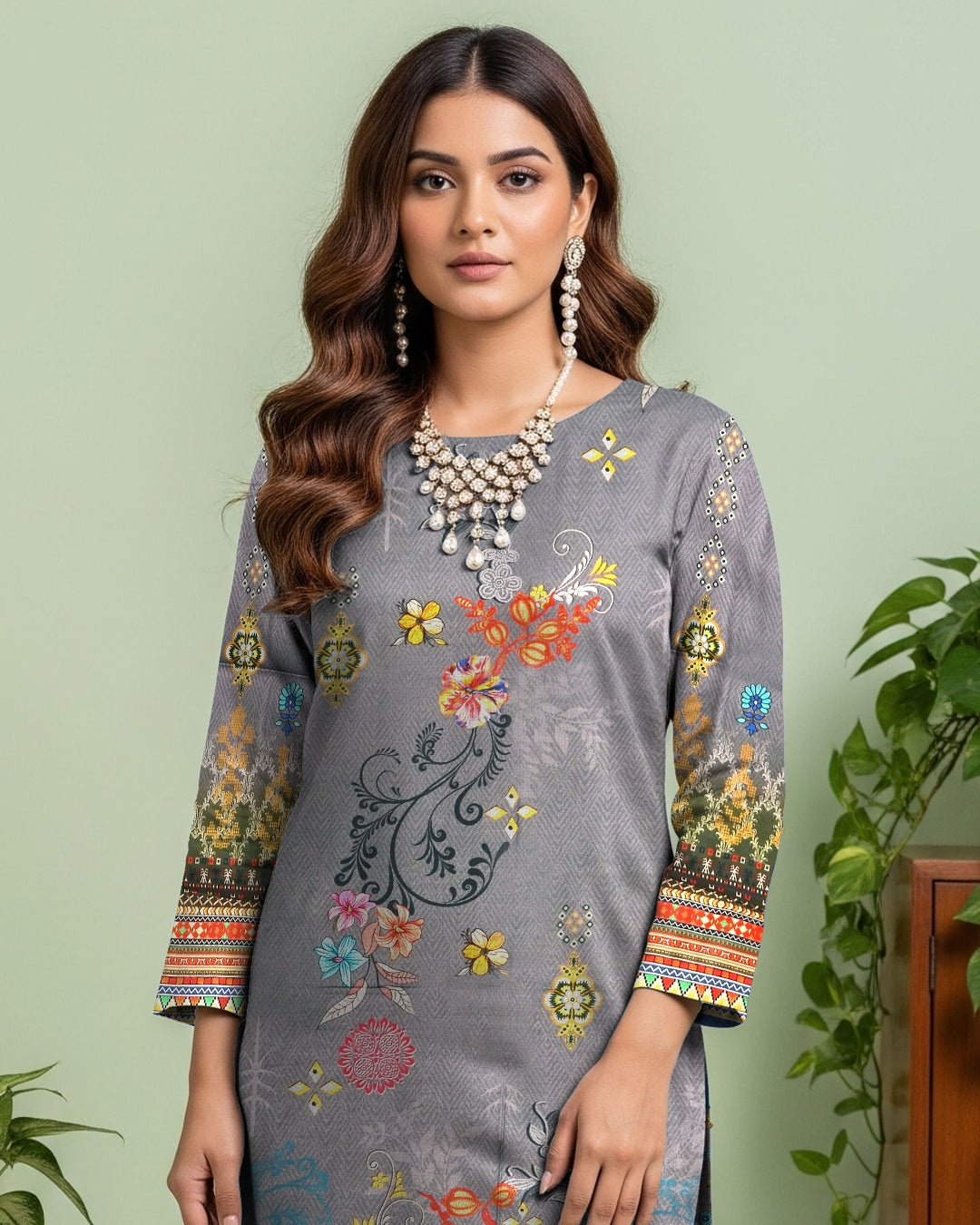 Ash Grey Linen 3-Piece with Artistic Print Dupatta
