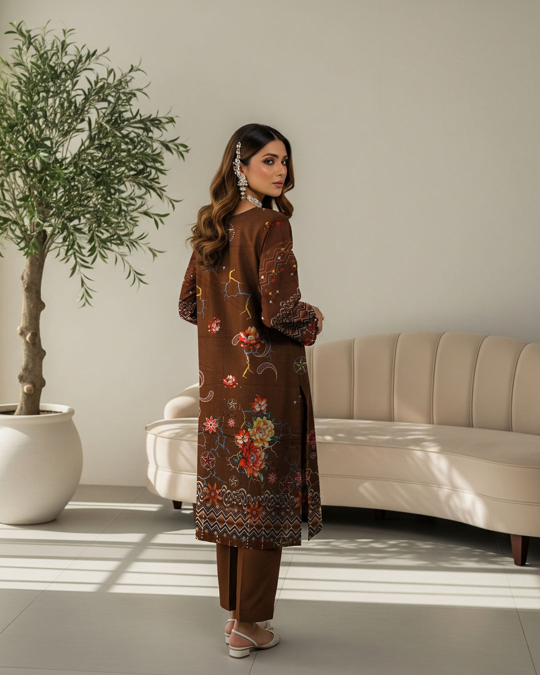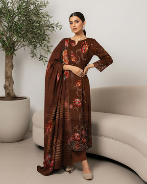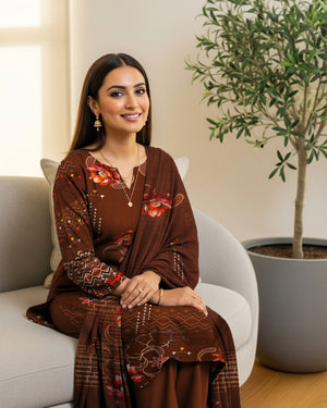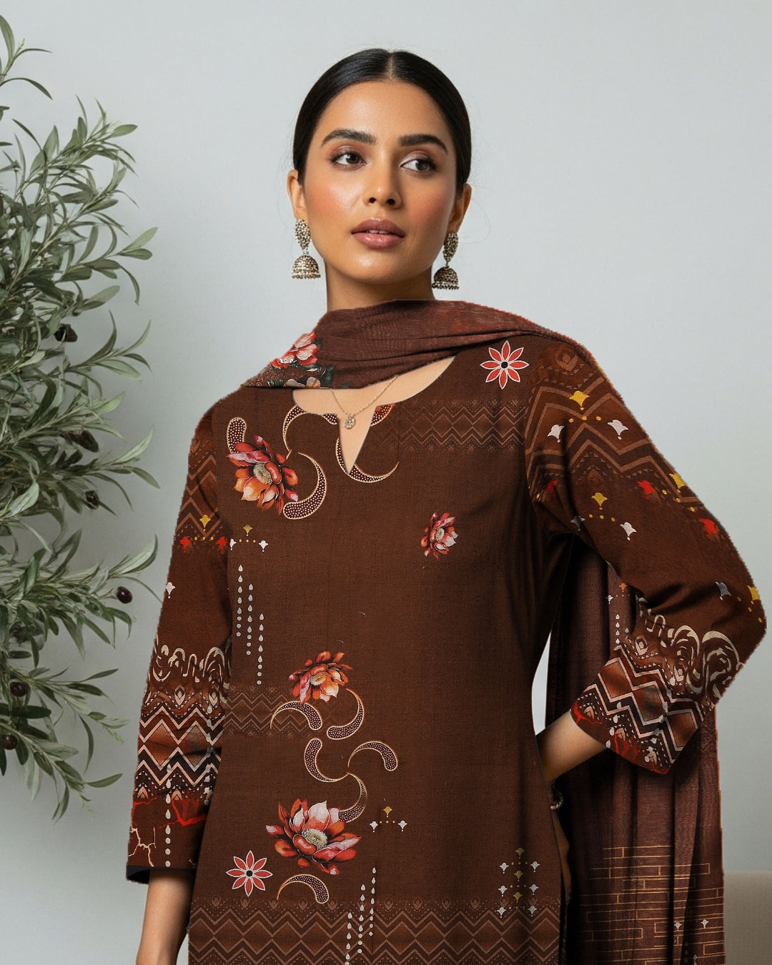 Cocoa Charm Linen 3-Piece with Traditional Motif Dupatta