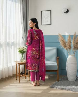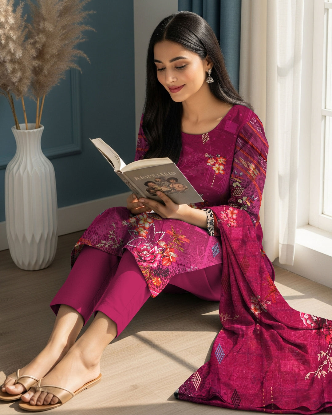 Magenta Blossom Linen 3-Piece with Cutwork Dupatta