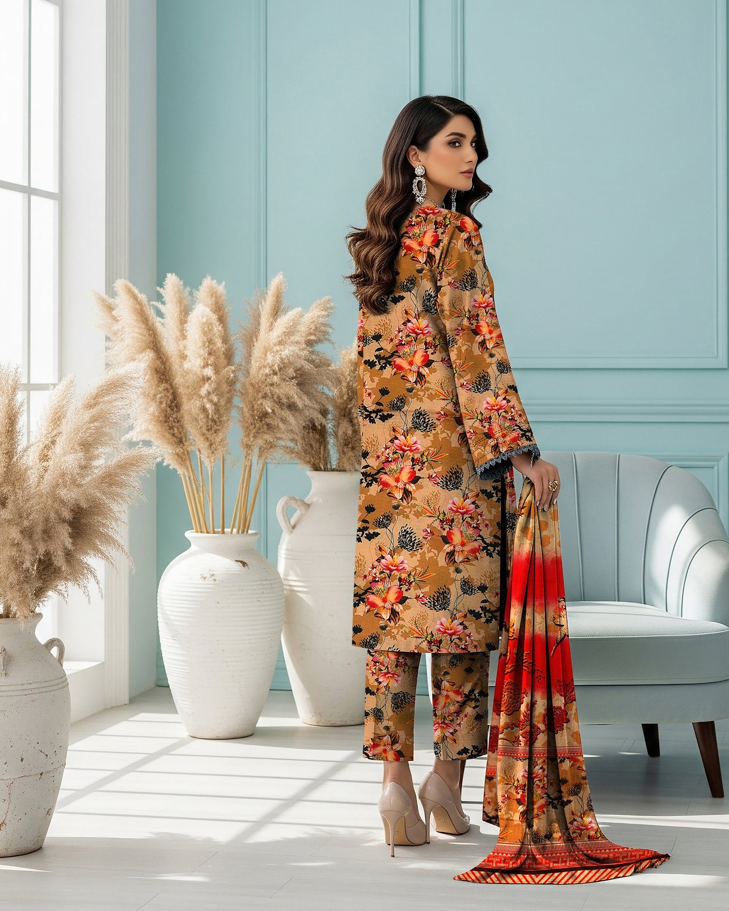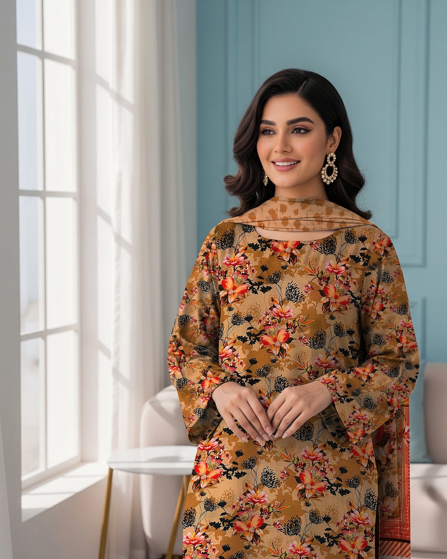 Elegant caramel shade with graceful print details